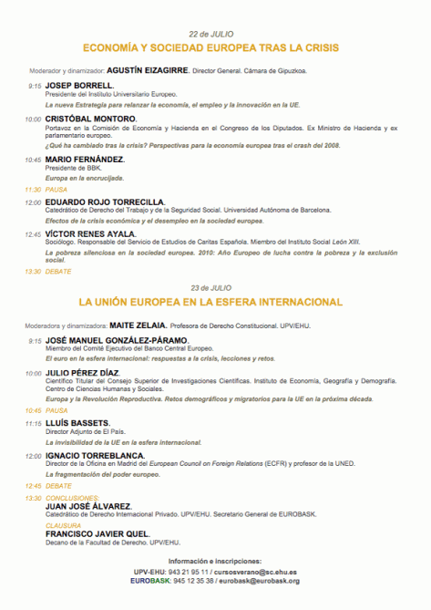 (23/07/2010) San Sebastián. Conferencia Europa y la Revolución Reproductiva. Retos demográficos y migratorios para la UE en la próxima década en el curso de Verano UPV/EHU Europa en el siglo XXI: ser o no ser, organizado por EUROBASK, Consejo Vasco del Movimiento Europeo. Palacio Miramar (Donostia-San Sebastián), 23 de julio de 2010.