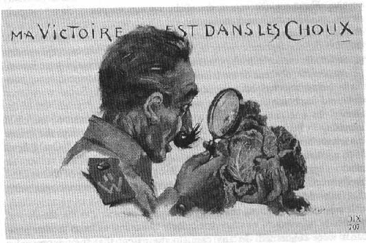 «Mi victoria está en las coles». Oficial buscando con lupa en la col, porque en Francia los niños no se les cuenta que los bebés los trae la cigüeña, sino que aparecen en el huerto bajo las coles.. Postal natalista francesa de la primera guerra mundial