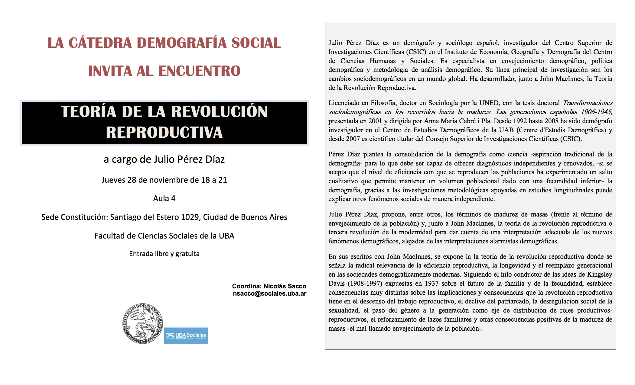 28/11/2013 (Buenos Aires, Argentina), tendré el privilegio de impartir un seminario abierto sobre la Teoría de la Revolución Reproductiva, en la Facultad de Ciencias Sociales de la Universidad de Buenos Aires.