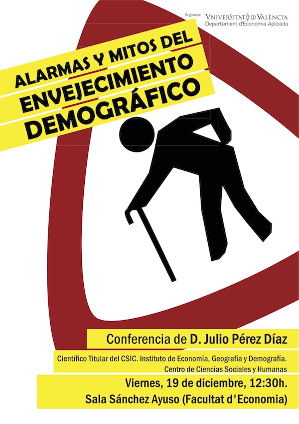 El próximo viernes, 19 de diciembre, tendré ocasión de exponer y debatir mi visión del cambio demográfico, sus causas y sus consecuencias, en la conferencia «Alarmas y mitos del envejecimiento demográfico». Ha sido organizada por el Departamento de Economía Aplicada de la Facultad de Economía de la Universitat de València, en la sala Sánchez Ayuso, a las 12,30h y la asistencia es abierta.