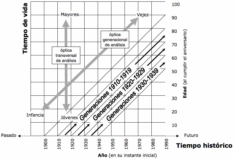 También es fácil con el gráfico explicar la diferencia entre la óptica transversal y la óptica longitudinal del análisis de los datos. Los datos empleados son de la misma naturaleza, y de hecho un mismo dato puede ser utilizado desde cualquiera de las dos ópticas. La diferencia está en cuál es el conjunto de datos empleados para tener una tabla completa por edades: los datos correspondientes a un instante o un periodo de tiempo (y entonces recogemos los datos «en vertical», correspondientes a las distintas personas, de edades diferentes, existentes en ese instante) o si los datos corresponden a las mismas personas, seguidas a lo largo del tiempo, mientras van cumpliendo las sucesivas edades (en ese caso recogemos los datos «en diagonal», correspondientes a una misma cohorte de nacimientos o «generación»).