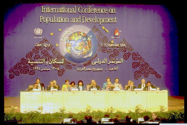 Egypt’s Population Min. & ICPD pres. Maher Mahran (C) & conf. secy. gen. Nafis Sadik (3rd fr. L) at UN Intl. Conf. on Population & Development. (Photo by Barry Iverson//Time Life Pictures/Getty Images)