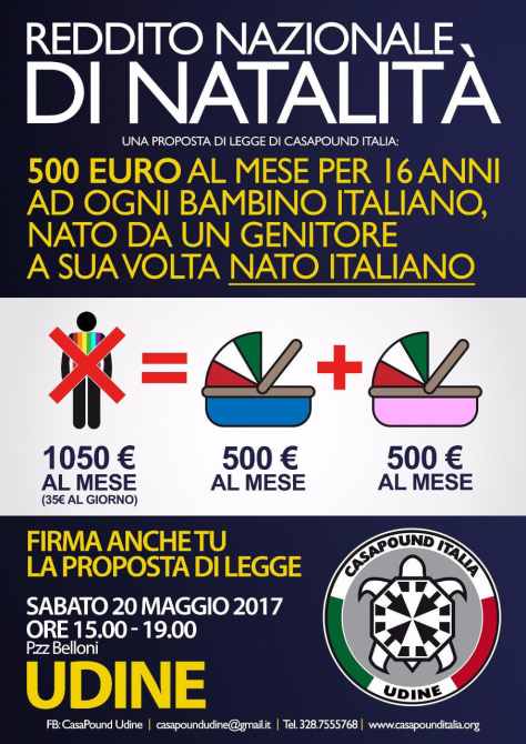 Existe una asociación muy antigua entre ultranacionalismo, natalismo y rechazo a la inmigración. El cúmulo de contradicciones y sinsentidos que conlleva nunca ha importado mucho a sus seguidores, creyentes en ese «nosotros» imaginario inmune a la lógica y eternamente amenazado por «los otros». Un buen ejemplo nos lo proporciona la campaña que este año emprendió Casapound Italia, recogiendo firmas para impulsar el Reddito Nazionale di Natalità (RNN), una asignación de 500€ mensuales por niño. Seguir leyendo Natalismo antimigratorio en Italia→